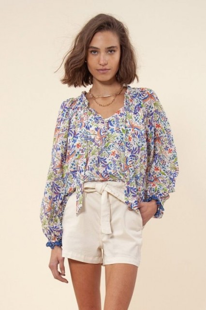 Blusen har V-hals og en liten sofistikert krage med brodert logo. De brede mansjettene er også prydet med logo. Laget av 100% bomull.