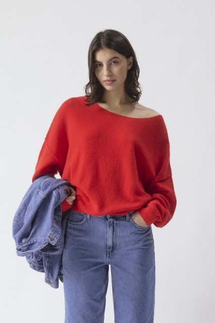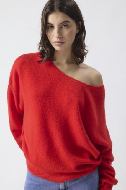 Strawberry ullmiks båthals-genser med utvendige sømmer som kan brukes off-shoulder fra American Vintage. Bestselger-modell. Laget av 32% ull, 48% polamid, 16% akryl 4% elastan. Svært STOR på størrelsen! Kun 2 størrelser: XS/S eller M/L.