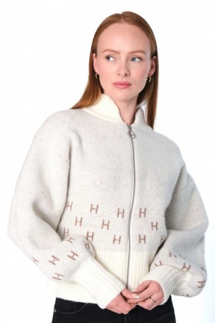 Kort strikkejakke med glidelås, høye ribber på ermene og nederst samt elegante "H"-logoer strikket inn i designet. Laget av av 15% alpakka, 30% ull, 30% akryl, 22% nylon og 3% elastan.